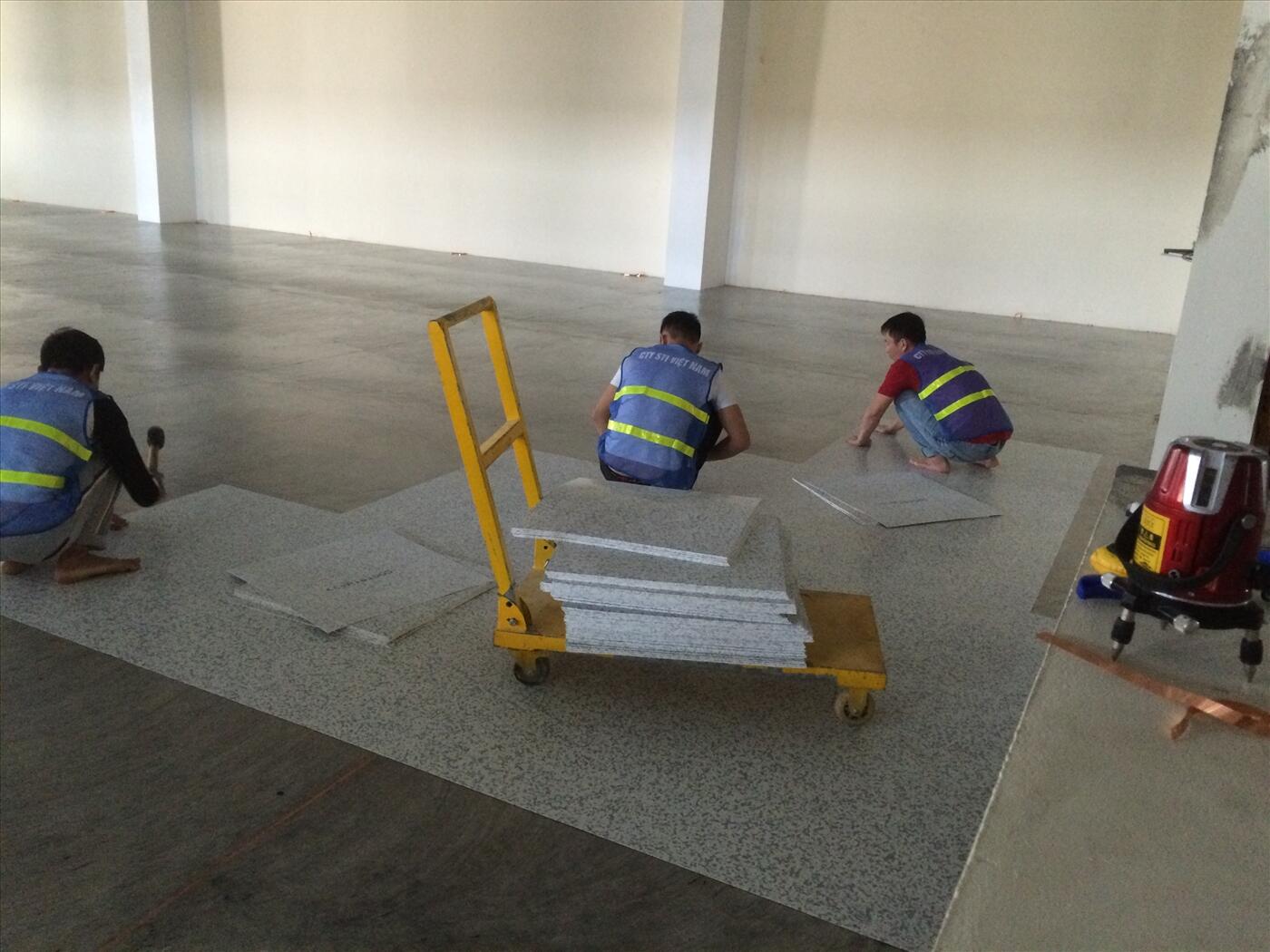 Lắp sàn vinyl chống tĩnh điện lên lớp keo theo các điểm mút, điểm chuẩn và đường chuẩn.